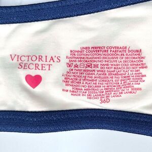 Set of 4 women's Victoria's Secret Lined Perfect Coverage cotton underwire bras, all size 36D and in excellent condition with minimal visible wear! Includes 4 bras in various prints: Victoria's Secret multicolored lettering on white background, pink & black stripes on white background with black straps, multicolored stripes on white background with aqua straps, and paisley print in shades of purple, pink, bright orange, & yellow on white background with purple straps.