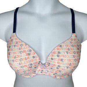 This bra style is perfect for everyday wear and features lightly lined cups in soft cotton fabric for a smooth and comfortable fit under a t-shirt. Bow detail at center gore. Adjustable elastic straps with knit-in Victoria's Secret logo. Bra with lettering print and striped bra with aqua straps have convertible straps that can be worn regular or crossback. Back closures on all have 3 rows of 2 hooks each.