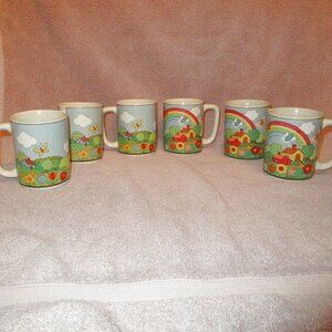 SET OF 6 Vintage OTAGIRI Butterfly RAINBOW Coffee MUGS Cross Stitch HOUSE Bird