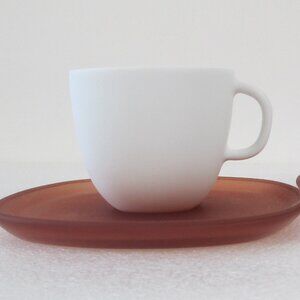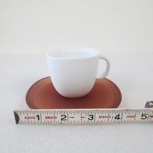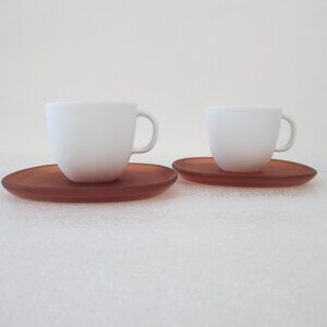 Set of 2 white matte porcelain Espresso cups (ca. 2.7 oz) and 2 translucent ochre red saucers.