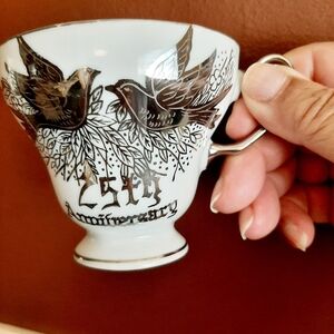 Vtg Kelvins fine china 25th Anniversary cups and saucers. EUC no chips or cracks. Dlight fading around edge of cup. Hand painted pair of doves with mirror finish to commemorate a 25th wedding anniversary.