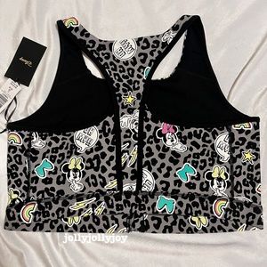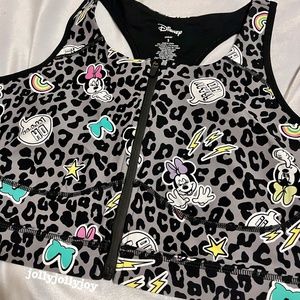 NWT. (Sports Bra) Wireless cups, mid length, low impact, full-zip front, racerback, sports bra silhouette. (Legging) High rise, tapered leg, cropped length, thick stretch waistband, side pocket. Both pieces are in size 2 and feature Performance Core knit fabric: smooths, lifts, supports, breathable to keep you cool, moisture wicking to keep you dry, smoothing tech delivers light compression, Minnie Mouse & leopard print. Set cannot be separated. Print placement may vary.