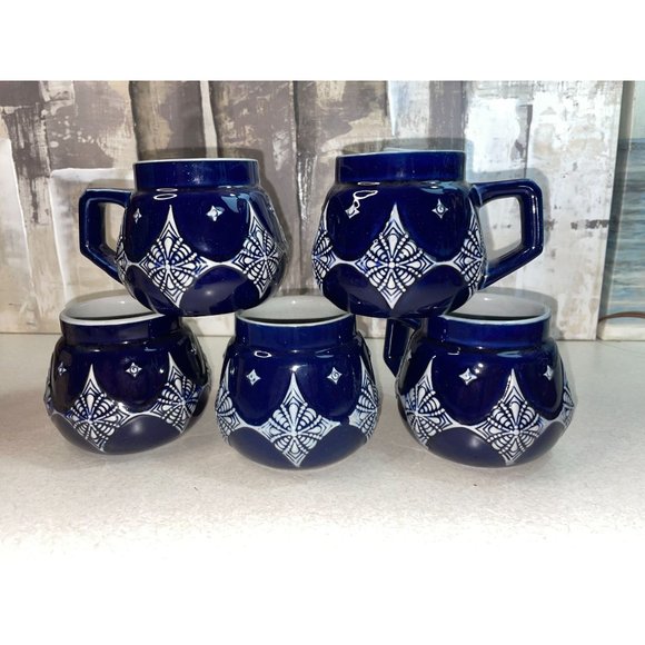 Description: Set of five AG Wick Werke cobalt blue & gray mugs/steins. Impressed art deco design. No chips or cracks. Interior with some crazing-see pics. Marked AG WW. One missing mark.