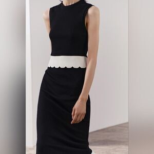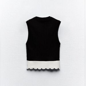 Sleeveless round neck top. Scalloped self trim at hem and skirt with hem.