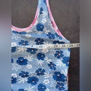 SET of 2 Floral Print Rib Knit Halter Crop Top Blue Pink Hibiscus Hawaii Summer