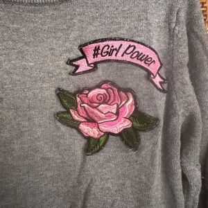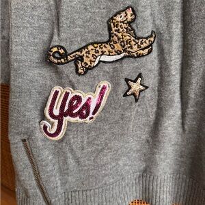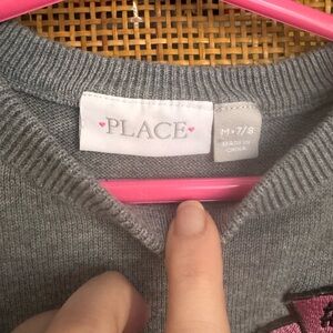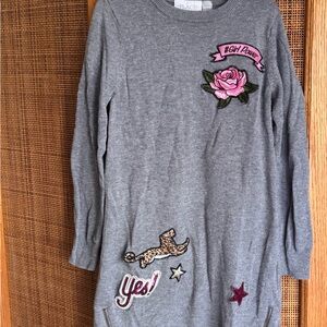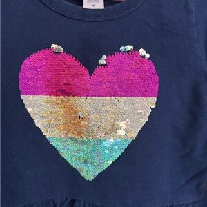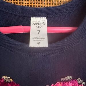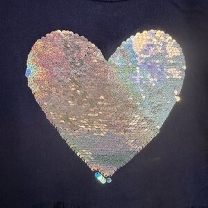 Two cute dresses for your girl! The grey sweater dress features sewn-on patches and zipper decoration at the bottom; size 7/8 and made by The Children’s Place. The navy blue dress is size 7, made by Carters, and features a reversible-sequin heart design on the front. Both dresses in EUC.