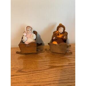 Both in great condition, some damage to crib as seen In photo. One with glass blue eyes and one painted. A little boy and girl both with handmade wooden cribs that rock back and forth.