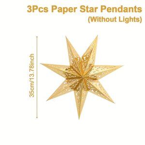 This set of 3 elegant 3D paper star hanging pendants is perfect for Christmas decor. Each pendant measures 14 inches and features a star shape with a gold color, making them a festive addition to any holiday display.
