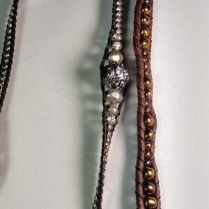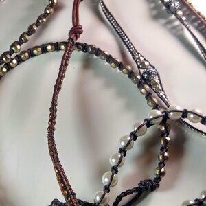 -- LUCKY Brand * shiny silver + antique silver beads strung + wrapped on leather cord (one Lucky Brand)