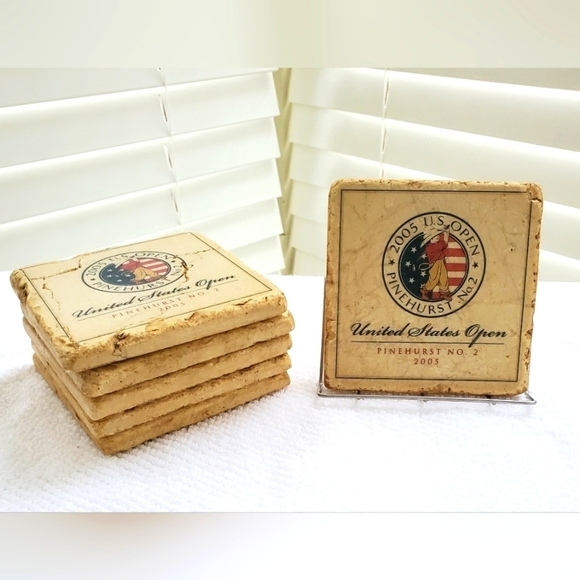 Vintage Pinehurst Number 2 tumbled stone coasters from the 2005 US Open Golf Championship. These coasters are made to look this way. They are unused and have been stored in my mother's china cabinet since 2005 🤦🏼♀️😂