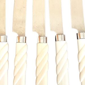 SET of 6 vintage table knives, stainless steel with white plastic handles