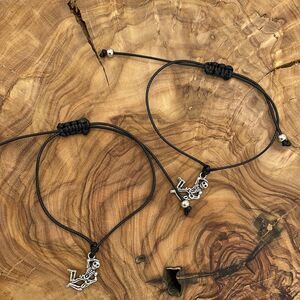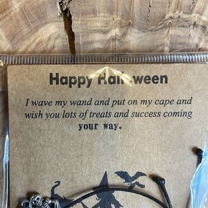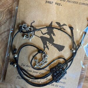 Two Skeleton thin black cord bracelet with small silver skeleton charms attached to Halloween gift card.