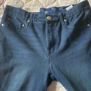 New with tags, faux front pockets, working back pockets, knit denim, limitless stretch, button and zip fly
