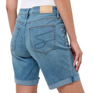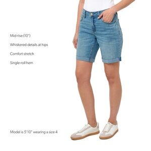 Mid rise Bermuda short, Sits below natural waist, Relaxed fit through the hip and thigh, Double roll cuff and fray hem. Stretch denim.