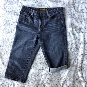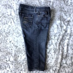 Cropped Capri thick stitching details throughout. 5 pocket, Zipper and button fly closure 18” inseam length. Waist 16”