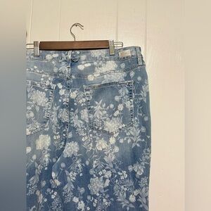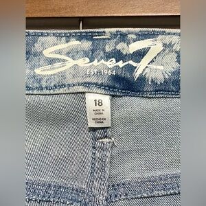 These Seven7 jeans feature a stylish blue and white color palette with a cropped ankle-length design. The denim showcases a unique artistic wash pattern, offering a casual yet chic look. Perfect for adding a touch of modern flair to any outfit.