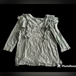 Excellent condition. Grayish olive green Heather with ruffled details across shoulders on back and front. Elbow length sleeves
