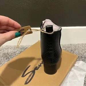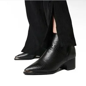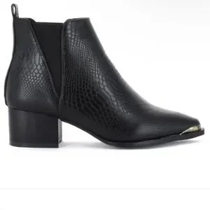 The Madison Python is a vegan leather pointed bootie with metal accents and a TPR outsole. Add some flare to your outfit with the subtle and classy python print.