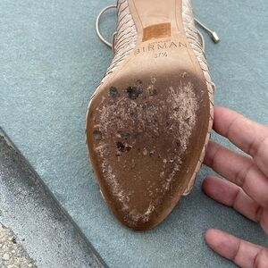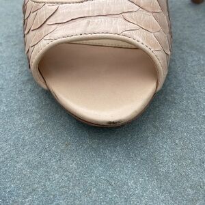 SEXY Alexandre Birman - Donna Python Breit/Baby Calf Soft Nude Wrap Sandals. I purchased these shoes from Saks 5th Ave for $850 a bit ago. They are a perfect Soft Nude color and are very sexy yet classy. They are a 4 in heel. I wore them one time and captured any minor signs of wear in the photos. I included a stock shot of how the shoe appeared in black on the website. These are great versatile shoes that are in excellent condition in a size 37.5. Comes with the original box and dust bag.