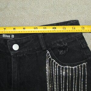 These Blue B shorts have the WOW, SEXY, BLING factor! Women's Size M Distressed Rhinestone Denim Shorts are solid black shortalls with a zip closure and a 5-pocket design. Made of polyester, cotton, and cotton blend fabric, these shorts have a flat front and a high rise waist with a 30-inch waist size. They feature rhinestone accents, a 3-inch inseam, and are designed for comfort. This American-themed coastal cowgirl style or sexy rock star-themed style is suitable for summer, fall, and spring seasons.