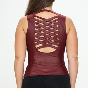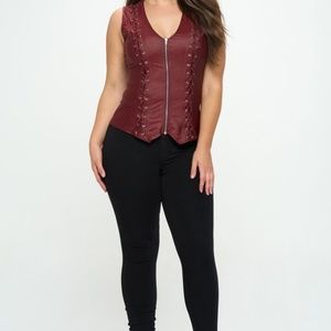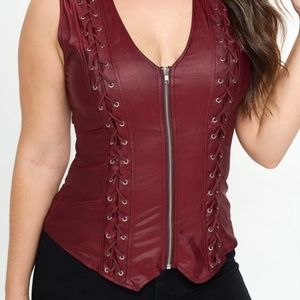 SEXY Faux Leather Zip Front Lace Up Strappy Fitted Vest Burgundy