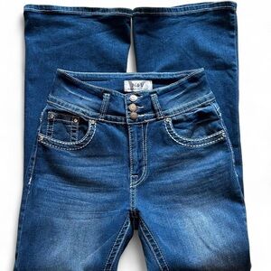 Step into the spotlight with these H & Y Premium Collection flare jeans — a bold mix of vintage glam and modern sass. Designed with a high waist, fitted silhouette, and rhinestone-studded flare legs, these jeans are made to turn heads and hug curves in all the right places.