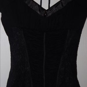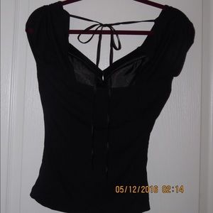 Black lace detail shirt. The back ties on the top and plunges in the front. Sexy classic and chic. Never worn.