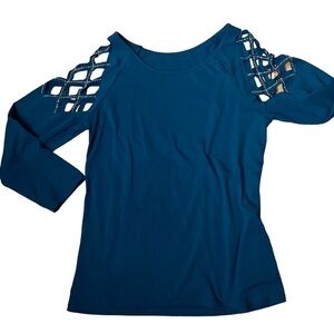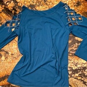Sexy deep turquoise blue too with cut out shoulders with rivets as sequins . 30%, cotton 65% polyester 5% spandex. Tag removed never worn.