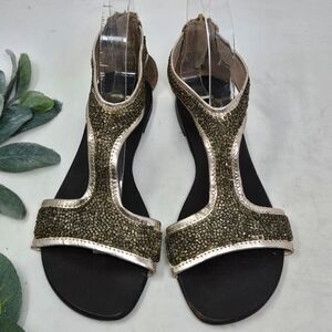 Women's size 7, beaded t-strap sandals with back zipper for easy on/off. Tell your style story with the Anthology sandal from Seychelles. This wearable work of art boasts hand-laid golden beading, adding glamour to any ensemble. The leather T-strap leads to a closed heel with an exposed back zipper; a rubber sole provides sure-footed traction. These are the exact pair you will receive, so please see all photos. Thank you so much for looking. I am always open to reasonable offers. Have a fantastic day!