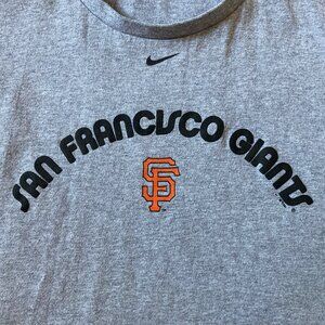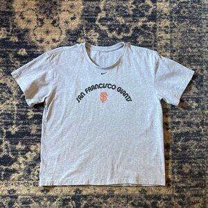 Selling this SF Giants women's short sleeve T shirt. It's light gray with black type and an orange logo. It's a think good quality cotton. Purchase from the Dugout store at the ballpark. No tags but the size is large. See measurements below.