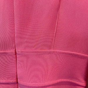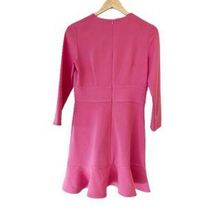 SFERA Collection sheath dress in pink. Featuring a round neckline, 3/4 length sleeves, ruffle hemline, concealed back zip closure, and midi length. Signs of wear, please note there are makeup stains on the inside of the neck.