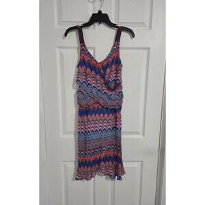 Colorful dress by SFIZIO. Made in Italy. In excellent used condition. This style usually sells at about $350 brand new. Size 10 (medium). It's sleeveless and a little bit stretchy for flexibility. Has straps which gives it a tank top design. It features a bright pink and blue chevron pattern with a slightly layered style. The material is super soft with a tight-knitted design. It's short length and sits right above knee to mid-thigh, depending on your height. It comes with a full length inner lining. It's only been worn a couple times and is still in excellent condition. Please compare measurements to your personal fitment before purchase.