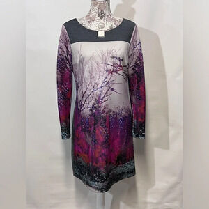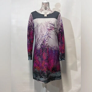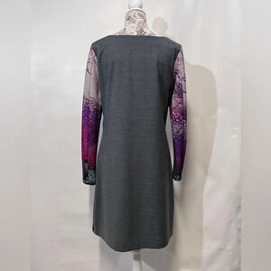 Gray with digital print front long sleeve midi dress from SFIZIO ITALY, size L. Dress has scoop neckline with metal accent.