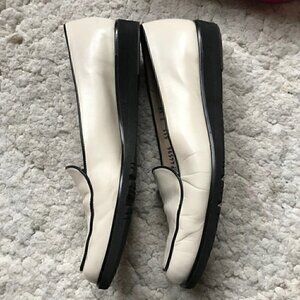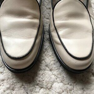 Salvatore Ferragamo Boutique Women's Vintage Cream and Black Piping Wedge (very slight incline) Loafers Sz. 7AAA. Salvatore Ferragamo Women's Cream Style: DP44596 Made in Italy. GUC with an entire life left to live. Very versatile and timeless. Easily dress up or down. Some wear/scuffs on shoes due to use. Use zoom to see intricate details/wear in photos and please ask questions prior to purchase.