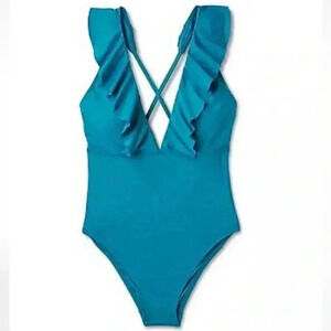 SHADE & SHORE - WOMEN'S ONE-PIECE TEAL CHEEKY SWIMSUIT RUFFLES STRAPS L (12-14)