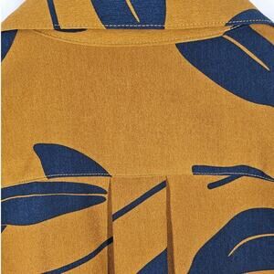 Introducing the Shades of Grey by Micah Cohen Men's Button-Up Short Sleeve Shirt a stylish and versatile addition to your wardrobe. This shirt features a predominantly brown color with a pattern of large, dark blue leaves scattered across it. The shirt has a collar and a button placket down the front with visible buttons. The sleeves are short, and the shirt is made from 100% polyester.