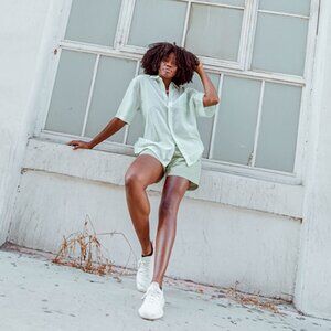 Casual mint green shirt with short sleeves. Ideal for relaxed outings. Comfortable and stylish.