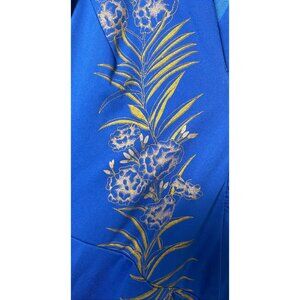 VINTAGE SHAHEEN 50'S 60'S HAWAIIAN FLORAL PAINT DRESS THAT WILL FIT A SIZE 6. THE DRESS FEATURES A FLORAL PAINT FRONT WITH A ROYAL BLUE POLY FABRIC. WHILE THE DRESS IS IN FANTASTIC CONDITION, HALF OF THE HEM IS COMING UNDONE AND WILL NEED TO BE RESEWN.. SEE PHOTOS.