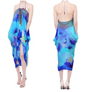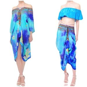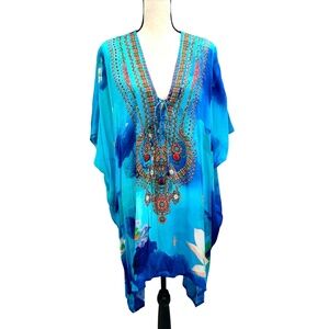 Shahida Parides floral print short caftan multi wear dress. Can be worn four ways for the style you'll love! Versatility ensures you'll never be bored of this silk kaftan. In excellent preowned condition.