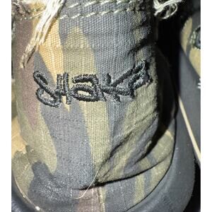 SHAKA men's slip-on shoes in camo canvas with raw-edge detailing around the collar. Foam-cushioned insole for comfort, lightweight casual design. A Japanese company with Hawaiian-inspired roots, SHAKA blends outdoor utility with surf and streetwear culture. This camo hybrid slip-on brings together Japanese-influenced style and Hawaiian casual ease. Very good condition with light wear, no stains, no rips.