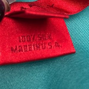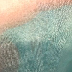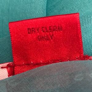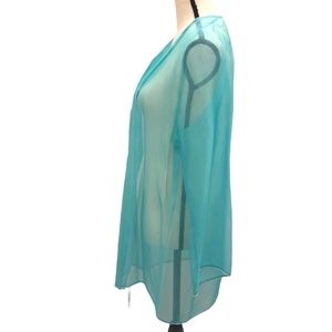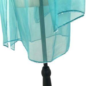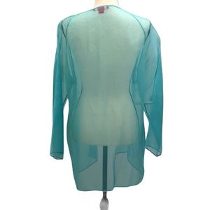 Shamask silk organza open jacket with iridescent beads around wrists, collar, around the bottom & down the front. Tiffany or turquoise blue. Semi sheer. Loose fitting. Shamask size 1 is a US 6/8. There are a few areas of marks on the top of the shoulders that should come off with dry cleaning. Very good preowned condition.