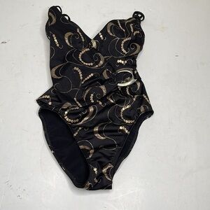 Shape FX One Piece Swimsuit Black and Gold Crossover with Gold Buckle Size 4