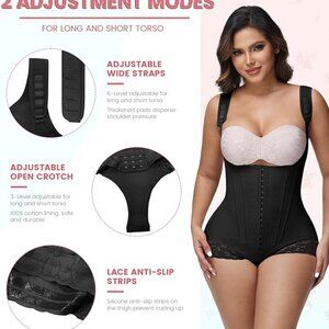FLEXIBLE ADJUST COMPRESSION & LENGTH: This fajas colombianas is equipped with sturdy 3-level adjustable hooks on abdomen, which allows you to adjust the compression degree freely, so as to meet stages 1 2 3 of your post surgery and postpartum recovery. The adjustable 6-Level wide shoulder straps and 3-level crotch design meet the needs of women with long and short torso