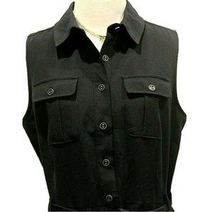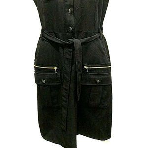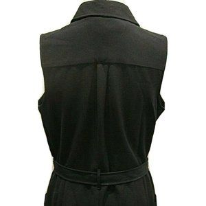 SHARAGANO Women's Size 10 Navy Blue Collared Tie Waist Sleeveless Sheath Dress. This sleeveless dress has a deep navy blue color hue, tie waist, six front pockets with goldtone hardware, and gold and navy button and zip front closure. The material is 75% Polyester, 20% Rayon, and 5% Spandex. The approximate measurements are as follows: Length = 39", Chest 44", Waist = 32", and Hips = 40". All measurements are approximate. Accessories sold separately.