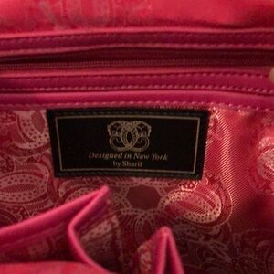 Discover elegance with this stylish leather handbag, perfect for any occasion. Beautiful deep pink satin lining inside black and grey leather satchel style handbag SHARIF ORIGINAL DESIGN FOR “WIZARD OF OZ” HSN EXCLUSIVE PREOWNED BY ME AND ONLY USED A FEW TIMES Missing the long strap, I don’t use them Has a missing piece of hardware on the side but doesn’t interfere with use