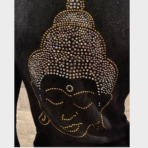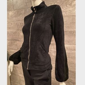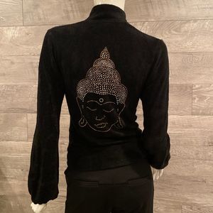 Very Special Piece!! Baby soft terrycloth with stretch. Balloon sleeve with elastic wrist, Zip front with snap mock neck collar. Front pockets and Buddha Rhinestone design on back.