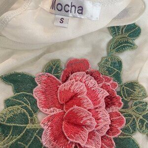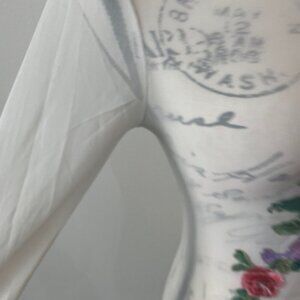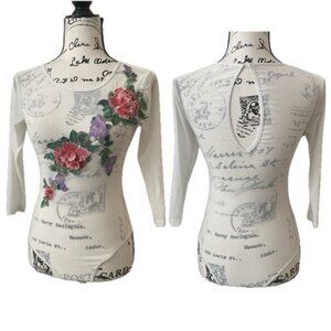SHEER BODYSUIT EMBROIDERED FLORAL SZ S 3/4 SLEEVE PREPPY SEXY CHIC AESTHETIC