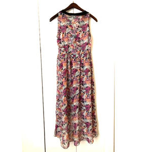 # floral dress, sheer dress, flower pattern, sleeveless dress, high low dress, see through dress, tropical dress, small medium dress, button dress, maxi dress, elastic waist, summer dress, spring dress