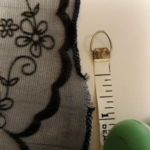 A1009. This delicate trendy and very versatile garment has a tulle overlay that features a floral lace pattern. The extra wide elasticized band at the top is a leaf-patterned lace. The lining is a semi-sheer crepe. Overlay extends about 4" below lining. Very flirty and beautiful. Unfinished edge at small spot on hem - not noticeable.See photo.