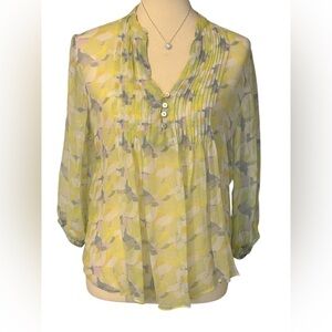 This delicate SHEER layering tunic is perfect for vacation over a tank or cami. It is a green, yellow, purple, blue and gray floral. Features button detail with pleats in the front and a pleated back. 3/4 elasticized sleeve. 100% Rayon and made in India. Freshly laundered and from a non smoking home. Measurements are approximate and to the best of my ability.